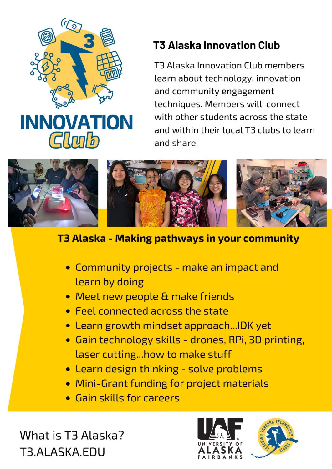 T3 Alaska is launching a statewide virtual Innovation Club to deliver programming in technology, innovation and community engagement techniques.  High school student leaders will participate in a series of workshops that build their understanding of growth mindset and design thinking principles, using technology as the vehicle. As they progress through the program, the students will collaborate with community partners to solve pressing community challenges.